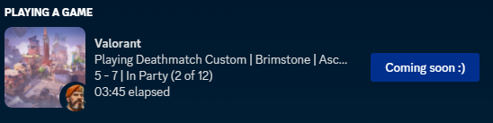Displays a fancy status under your Discord profile through Discord's rich presence feature about your Valorant game/status, through a combination of screen reading with Google's optical character recognition and Valorant's internal API. Don't worry, this won't touch the Valorant process's memory at all :)