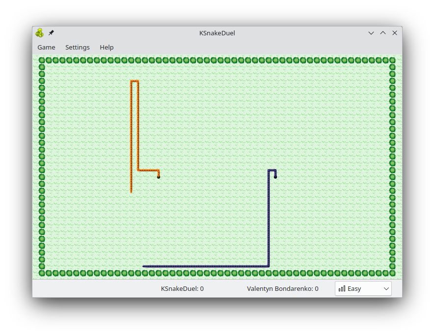 It also includes kdesnake, a special mode of the game where you can play the classical snake action game. In snake you steer a snake which has to eat food. While eating, the snake grows. But once a player collides with the other snake or the wall, the game is lost. This becomes, of course, more and more difficult the longer the snakes grow.