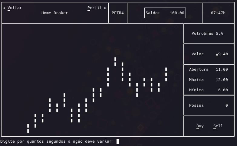 Um jogo em terminal que simula uma interface de uma corretora de valores de maneira simples e intuitiva, com Home Broker, carteira, empresas fictícias e opção de compra e venda de ações.