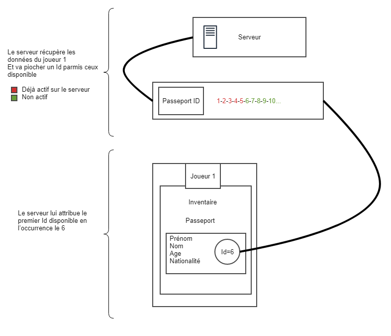 A mon arrivée sur le serveur, je recevrais un passeport qui contiendra les informations de mon personnage. Disons que la classe d’un passeport soit Item_Passeport et que le premier libre soit le numéro 6. Les informations de l’item complexe Item_Passeport_6 seraient donc : [Mon prénom, Mon nom, Mon age, Ma nationalité, ainsi de suite...]