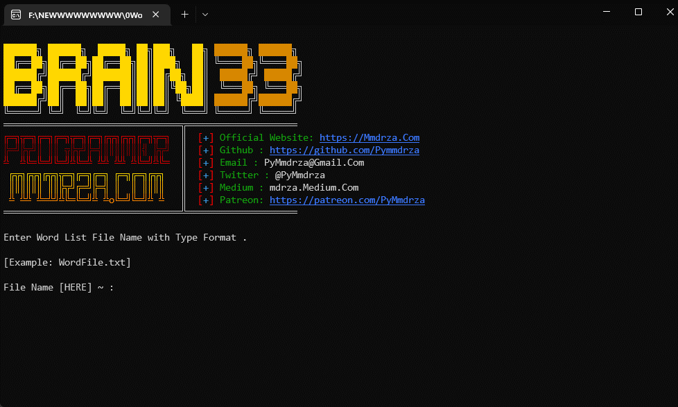 in all file's imported Word List File With name gword.txt [Update 2023] if have another password list or word list can past in folder and first section in running input your list file name enter.
