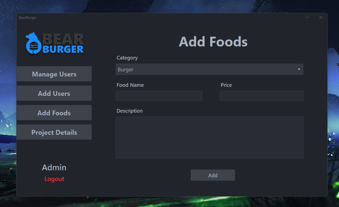 - Download and run BearBurger-Swing.jar