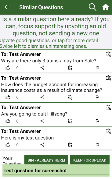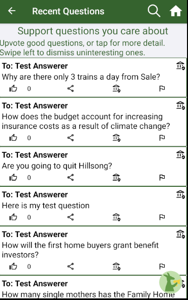 - Each question has the ability to be Upvoted, Shared, Answered, or Flagged/Reported as buttons shown below the question text