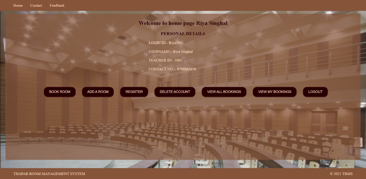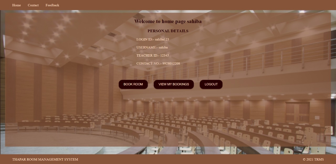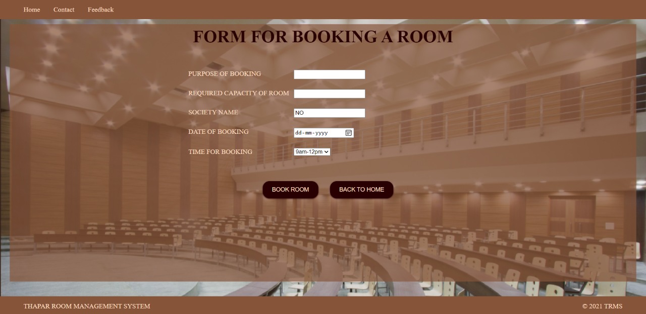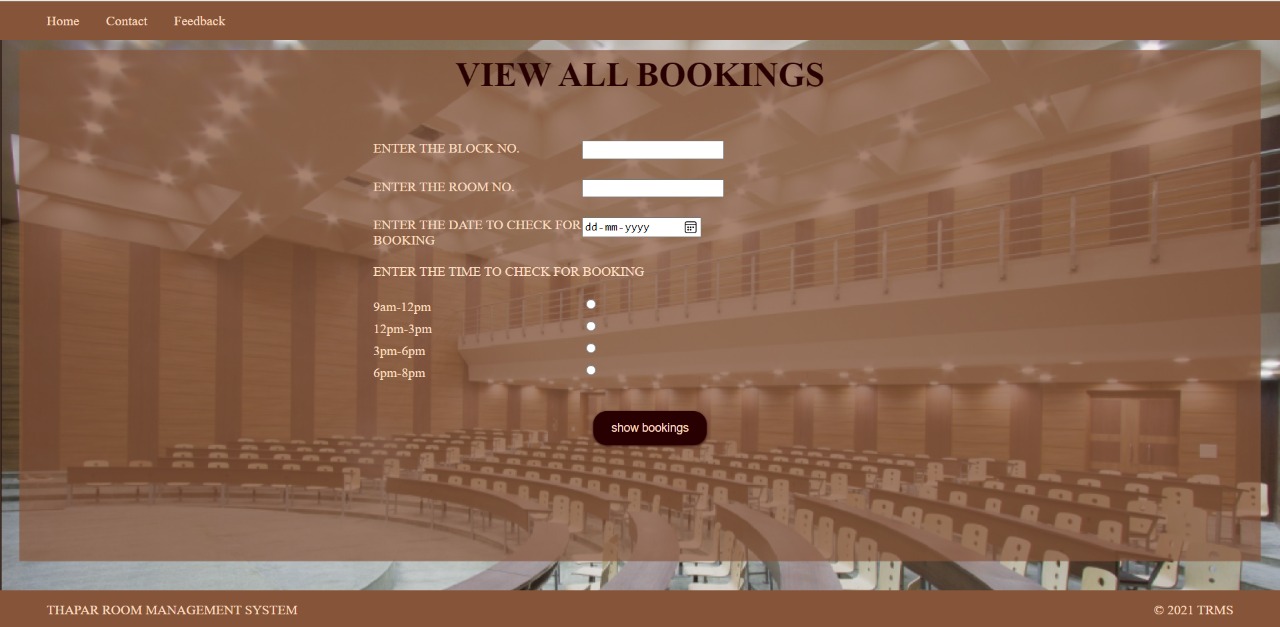 TRMS website is made with a motive to reduce the paper work required to book auditorium and other activity rooms in colleges. One can book room, view their bookings and cancel their bookings as per their comfort. There would be two categories of users: 1. User 2. Admin