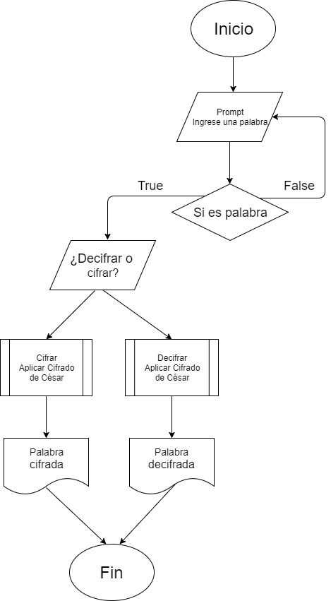 La función caesarCipher pide al usuario por medio de un prompt que ingrese una palabra, si el usuario ingresa números o espacios se le recordará por medio de un alert que debe ingresar una palabra, sin espacios ni números.