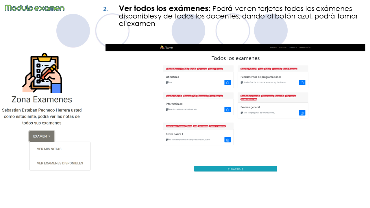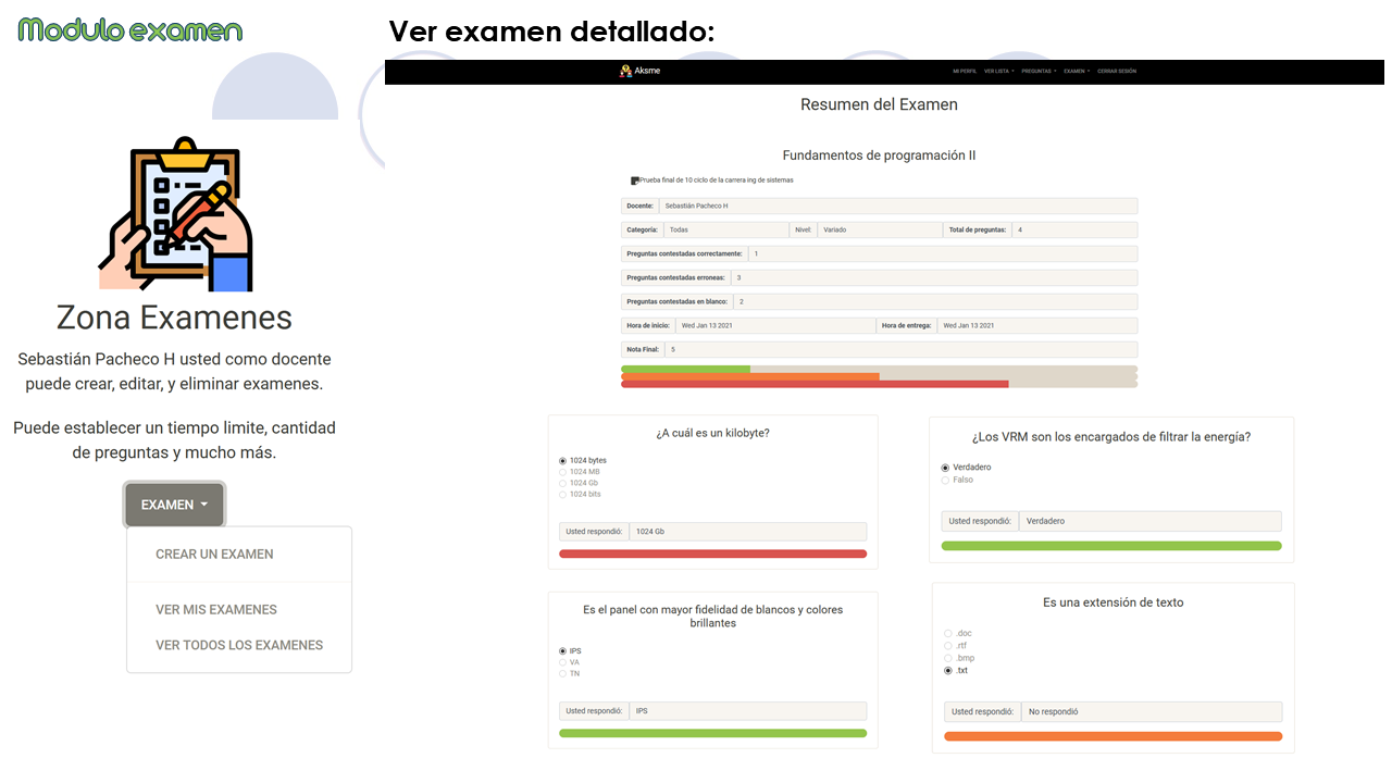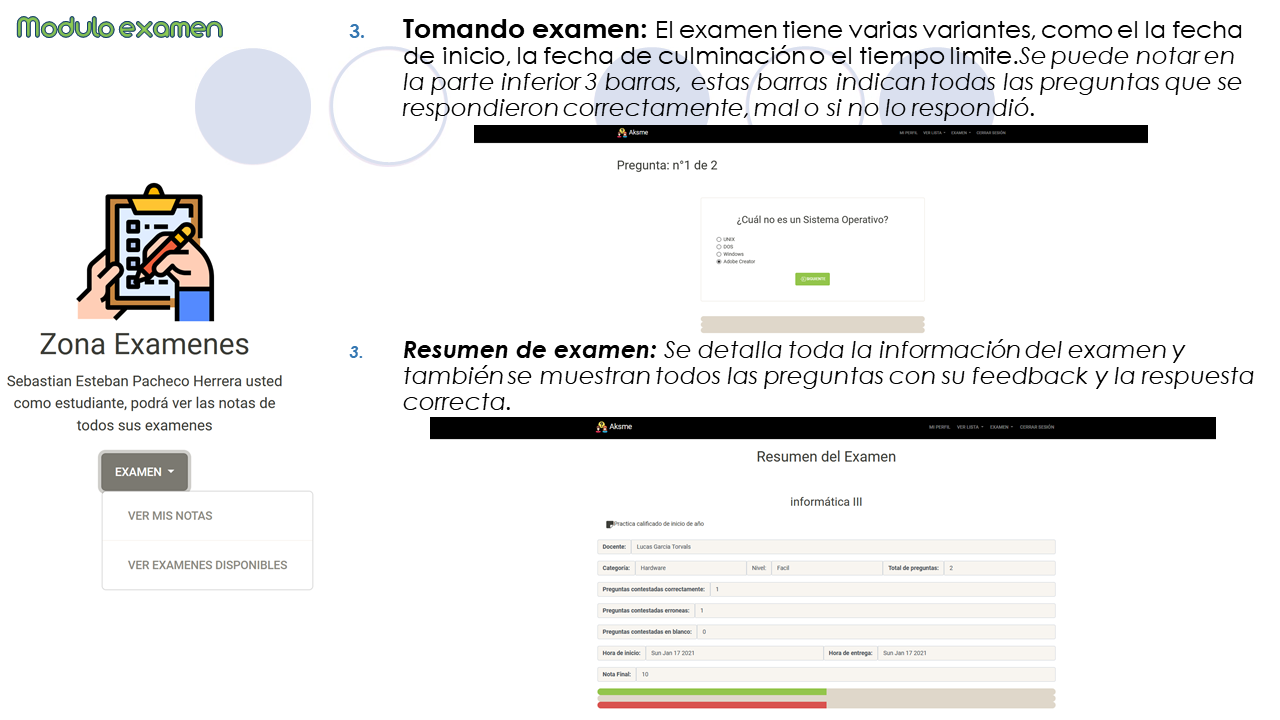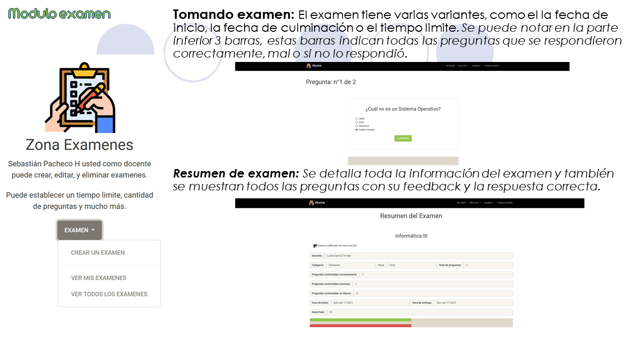 Aksme es una plataforma WEB, que tiene como finalidad unir a estudiantes y docentes, el docente podrá crear preguntas y exámenes con tiempo y a una fecha y hora específica para habilitarse, y los estudiantes podrán tomarlos y ver los resultados al instante. El docente puede ver las notas y administrar los exámenes