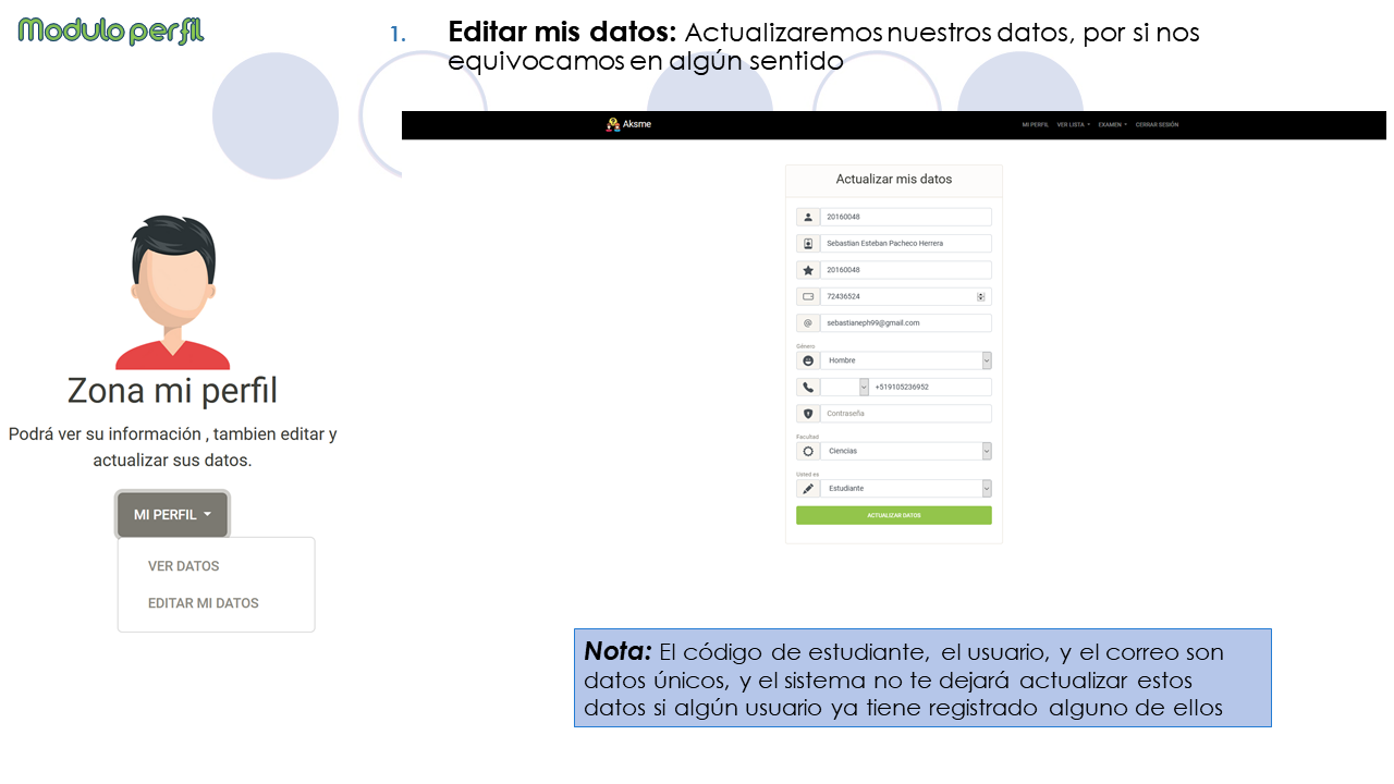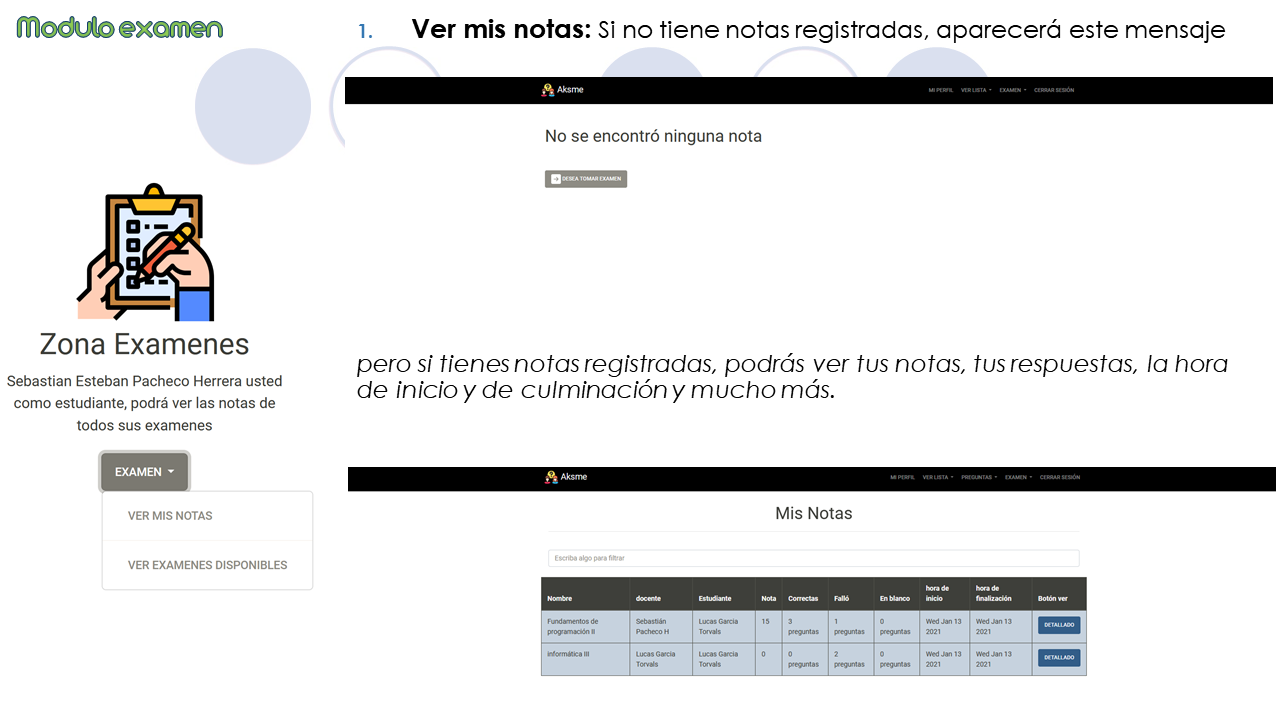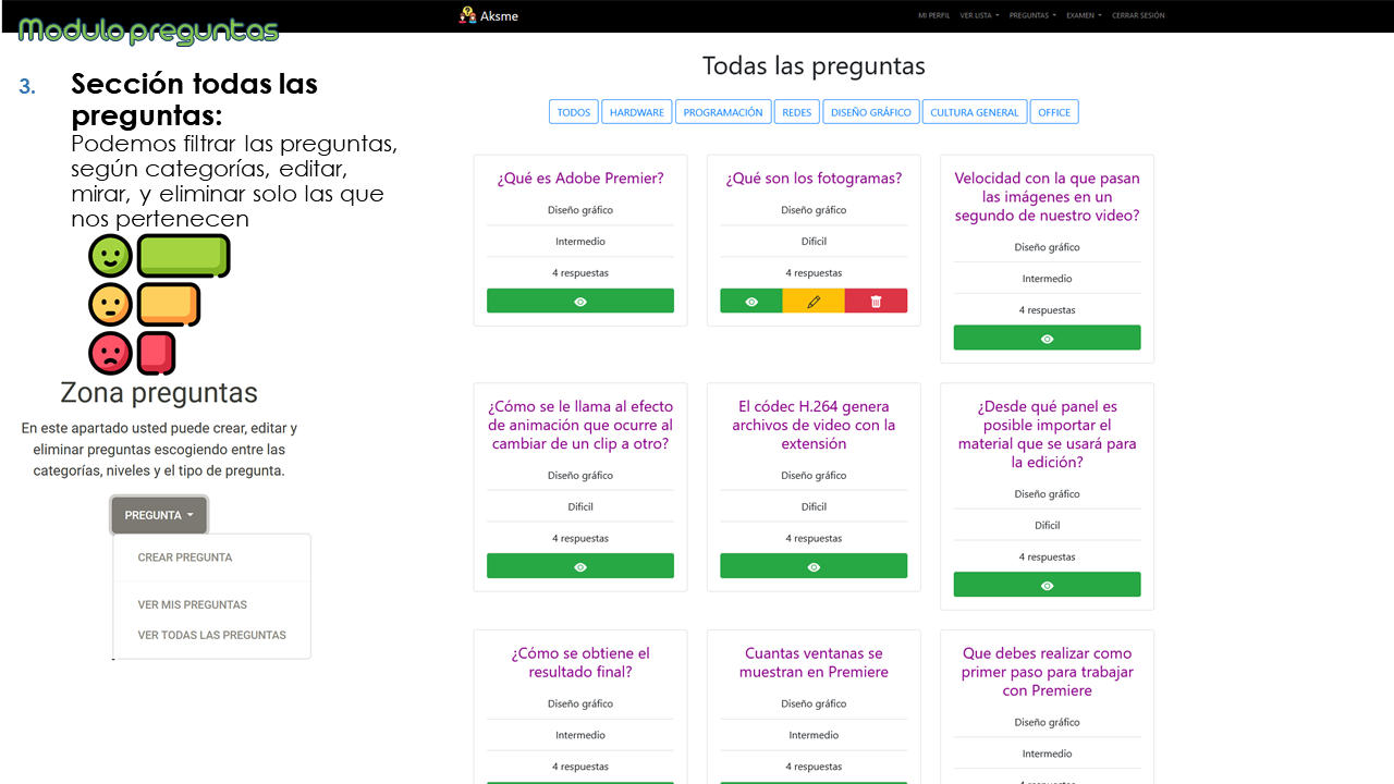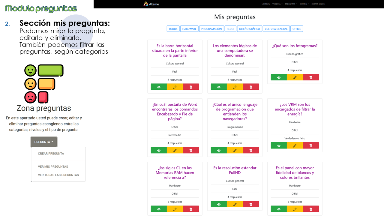 Aksme es una plataforma WEB, que tiene como finalidad unir a estudiantes y docentes, el docente podrá crear preguntas y exámenes con tiempo y a una fecha y hora específica para habilitarse, y los estudiantes podrán tomarlos y ver los resultados al instante. El docente puede ver las notas y administrar los exámenes