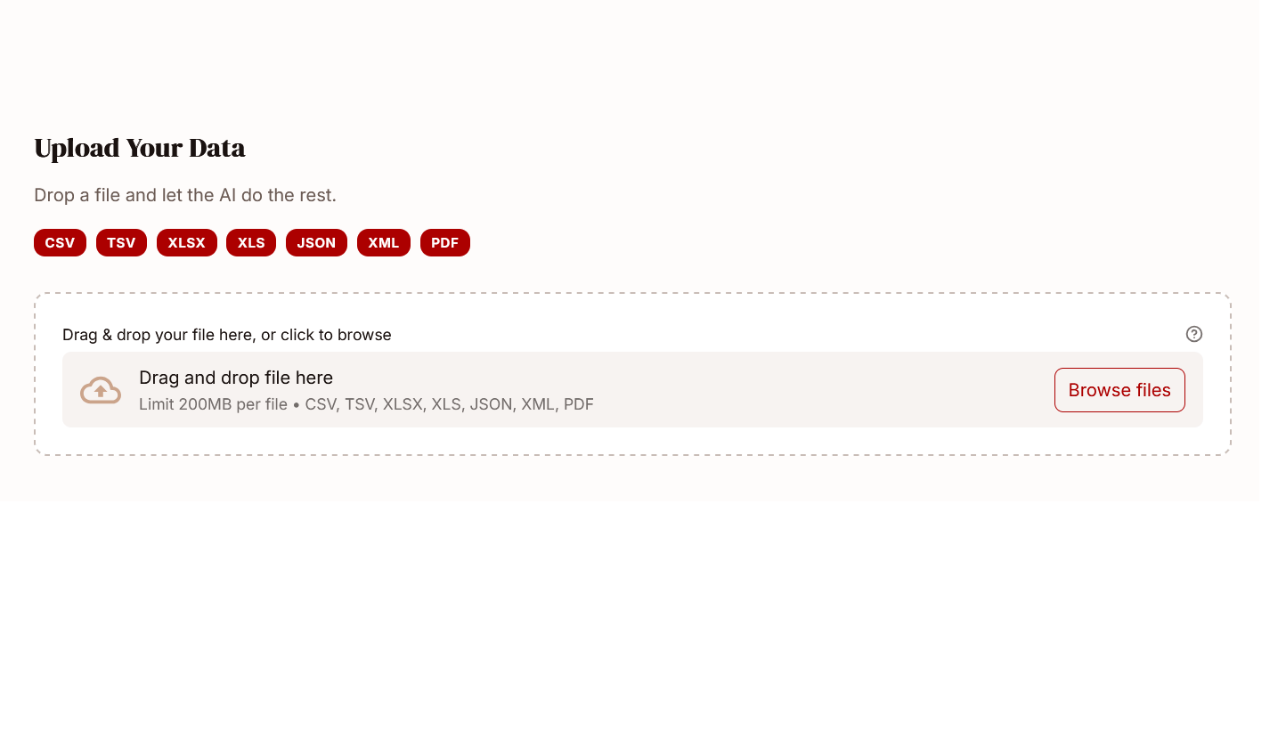 - Upload any messy data file β CSV, Excel, JSON, XML, or even a PDF with tables