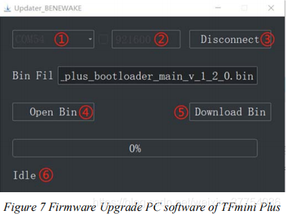 Upon successful connection, open the Updater.exe. Select right port, here is “①COM8”. Input the right baud rate in “② 115200” and click “③ CONNECT” to connect the TFmini Plus with the Updater. Click “④ Open Bin” to choose the updating firmware, whose directory will be showed in the textbox above. Then click “⑤ Download Bin” to start upgrading. The information of upgrading will be showed in “⑥”.