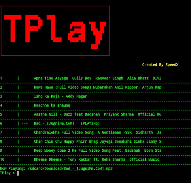 This is a Termux MP3 Player (CLI) By SpeedX This is Just A Geeky MP3 Player To Give you an Awesome Feeling Of A Hacker....