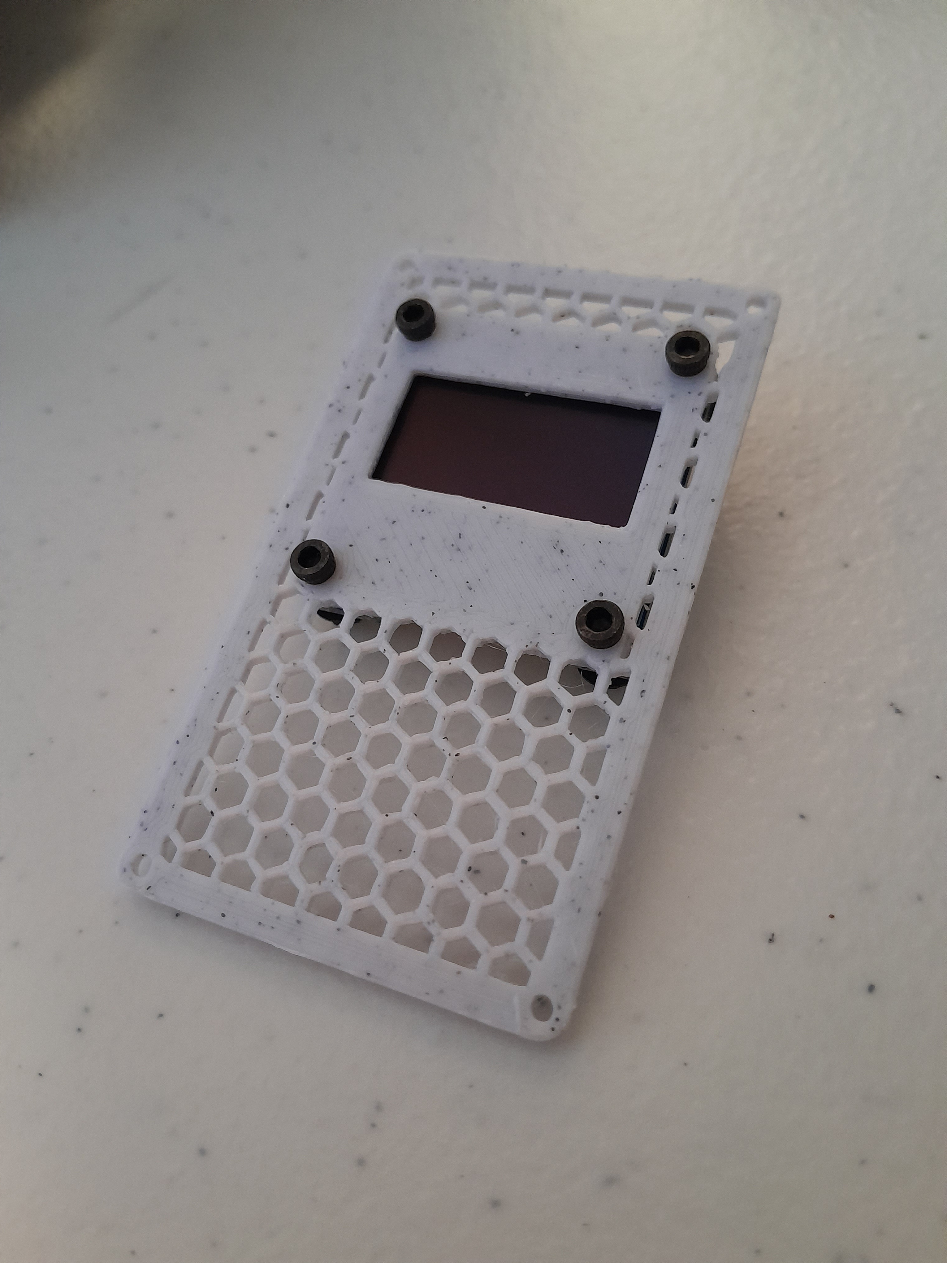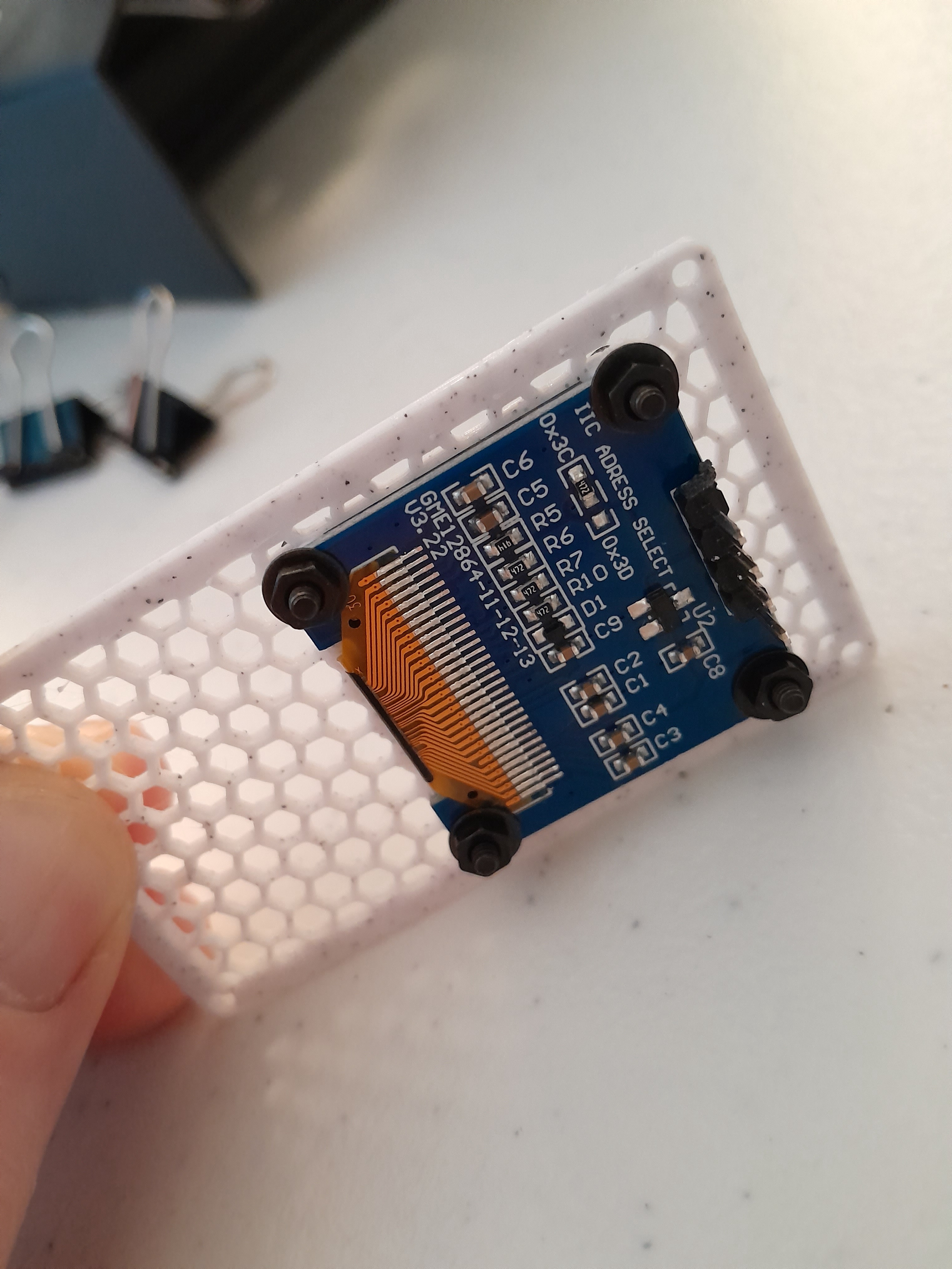 - Mount your SSD-1306 OLED display to the top.stl you printed (the lid of the box) with four M2 screws.