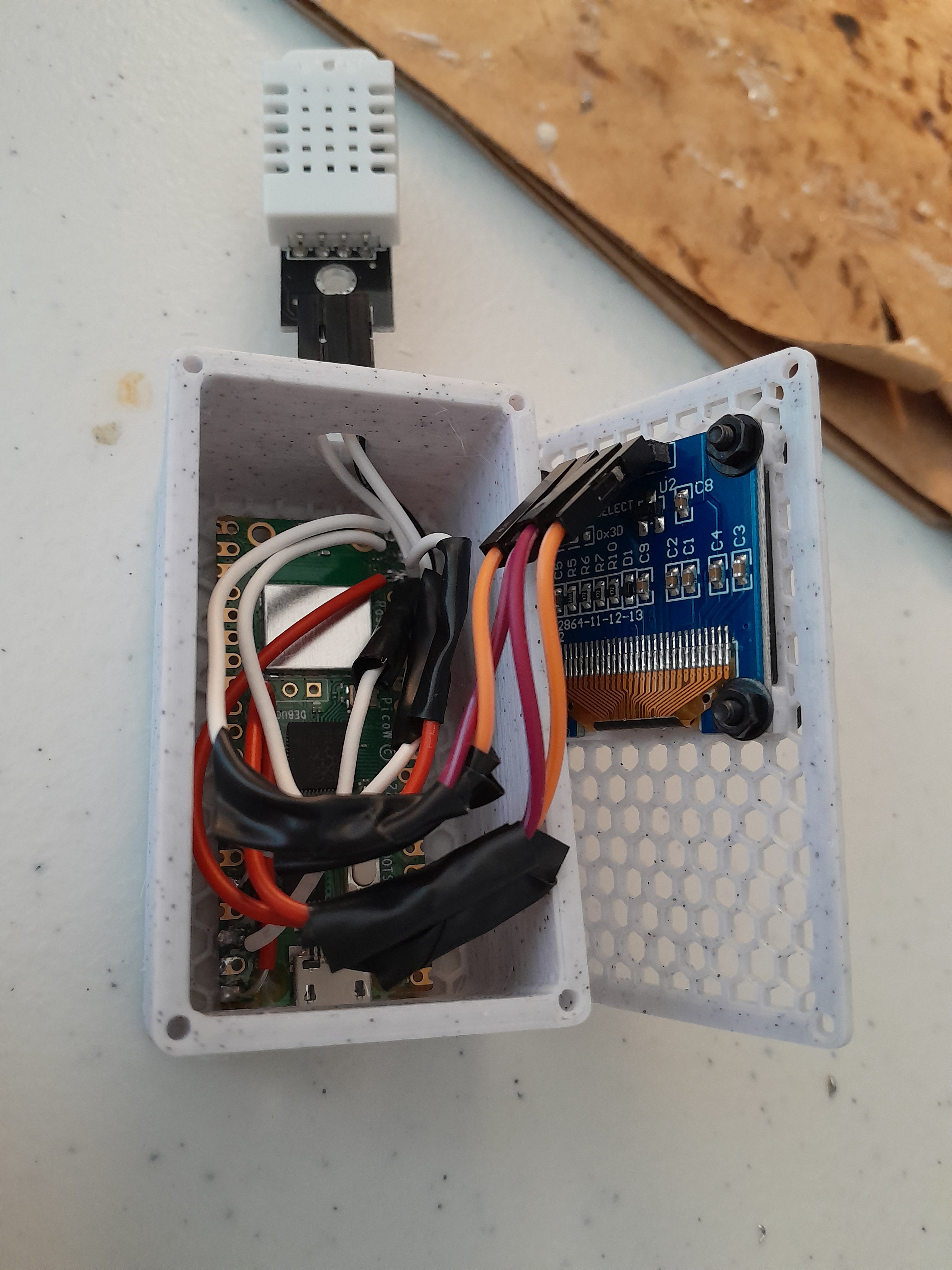 - If you printed the bottom with the hole (recommended), slip your wires through the hole, connected to the DHT-22 sensor externally, and the Raspberry Pi Pico internally (soldered).
