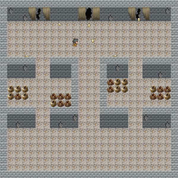 addMapLayer(-2, ground);This map layer has 3 tiles, . is a black tile to make a black background, 1 is wooden floor, and 2 is the same wooden floor but with a hole. More tile can be defined using the addCharTileMapping function, where the first argument is the char representation in the map char matrix, and the second argument is the specific tile that should be drawn when rendering. Tile takes a file name, and the row number and the column number of the tile in the tile set. This use of map char matrix and char tile mapping provides a more visualizable way to create a map and also make it very easy to make changes to the map. In the case of the ground MapLayer, I just need to change some 1 to 2 in order to make a hold on the ground. Last thing about the MapLayer, is the first argument in addMapLayer. The -2 in this case is the z-index of the MapLayer. The game is currently hard coded to not handle collision detection for map with z-index less than 0 and greater than 10, and the map with a lower z-index will be covered by map with a higher z-index. So this groud layer of the map will be drawn under the wall layer, which ahs a z-index of 1, and the character can walk freely on it because it is not subject to collision detection.