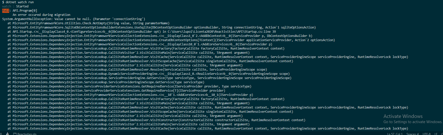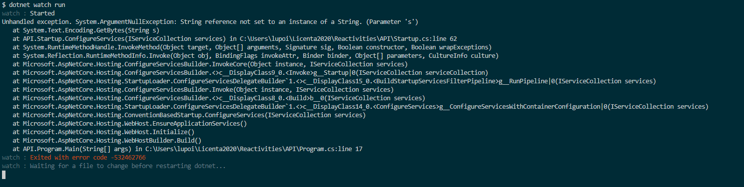 I have completed first 15 section of your course but i`ve made a mistake and i take my last commit from Git. After i install all necessary(mobx, react,axios etc.) and no longer show me problems in problems log, i executed dotnet watch run and i receive this error. What can i do? I can't open the database too. Please help!