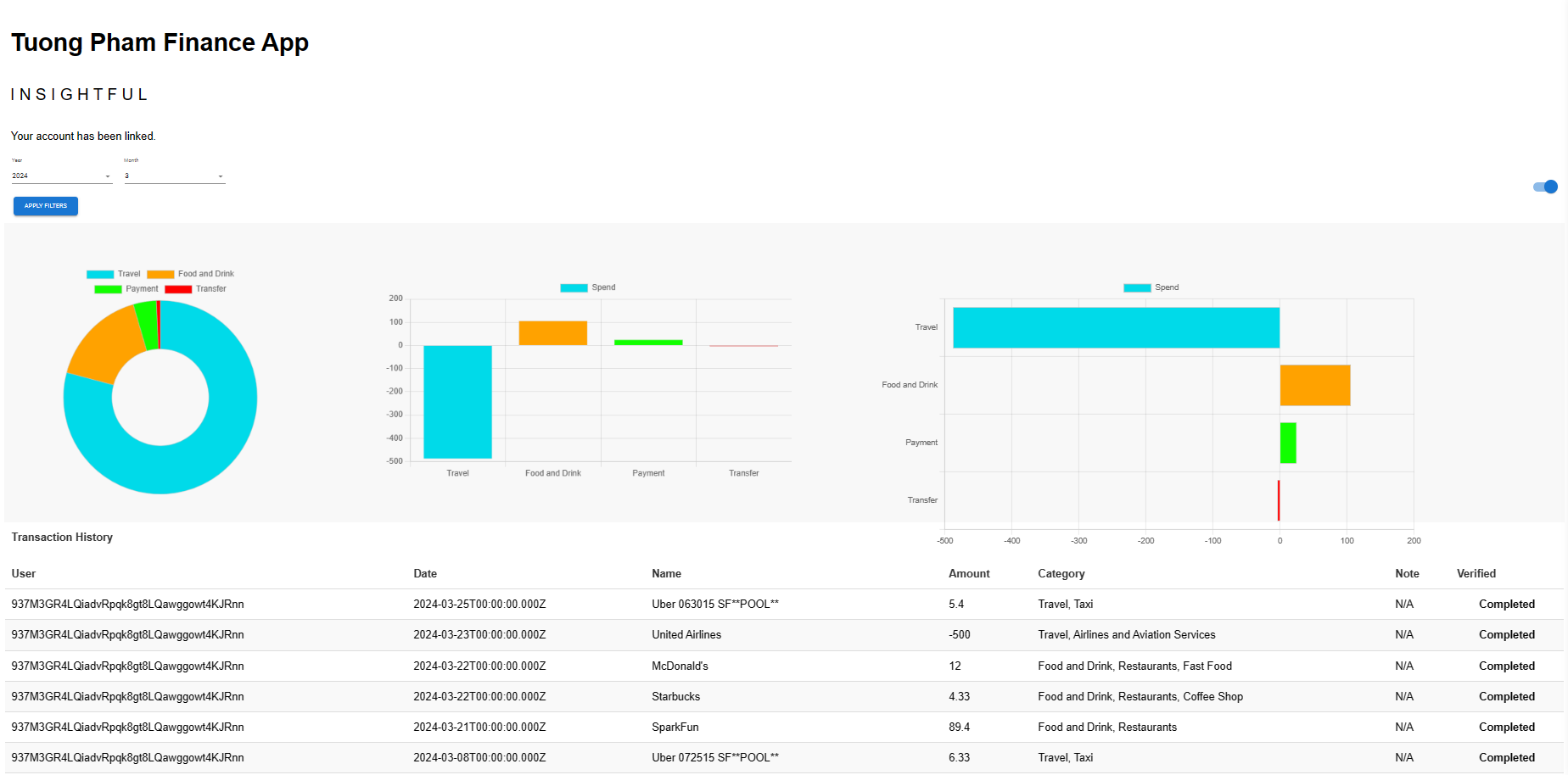 Transaction Tracking: Users can connect their bank accounts via Plaid to automatically fetch and categorize their financial transactions.