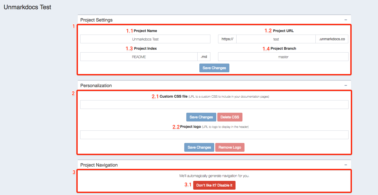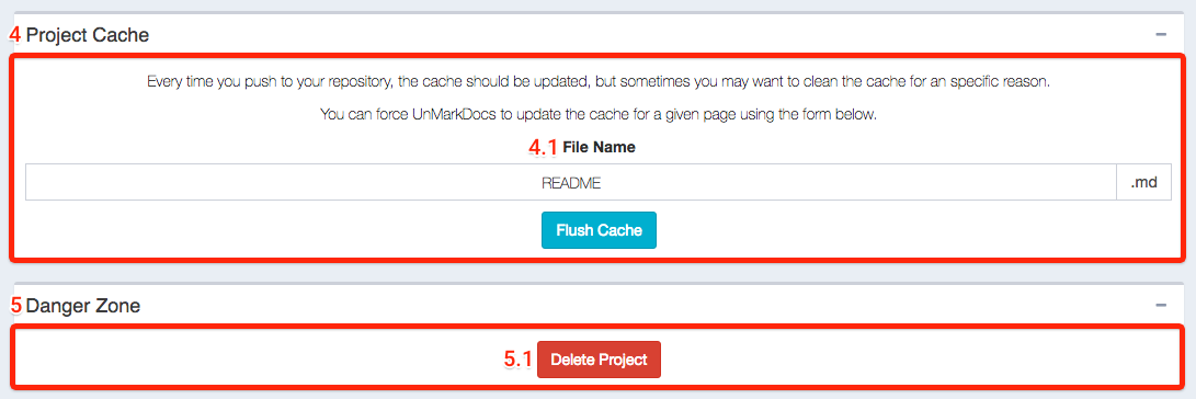 - 5.1) This setting allows you to delete the project from UnMarkDocs. Note that using this option will not delete the repository from GitHub nor erase any content from it.