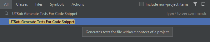 All these commands are available via Search Everywhere: go to Navigate > Search Everywhere and enter UTBot: Generate Tests.