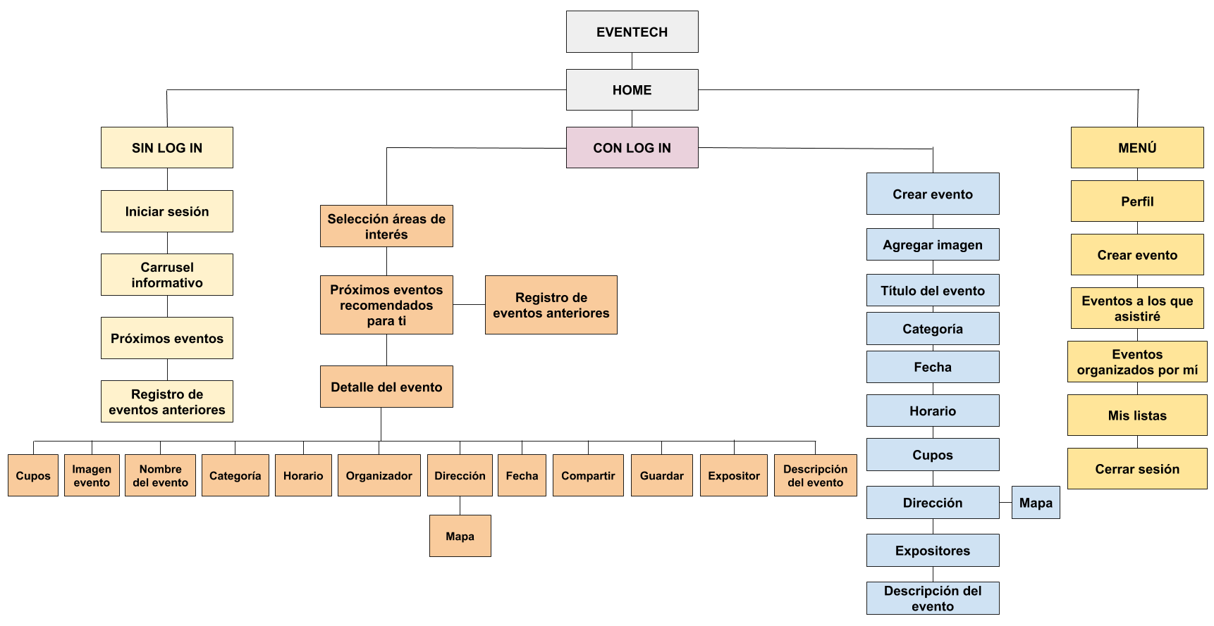 De esta manera pudimos determinar cuál será la experiencia que tendrá un usuario cuando acceda a la web app. Y así poder determinar dónde estarán ubicados los diferentes contenidos de navegación.