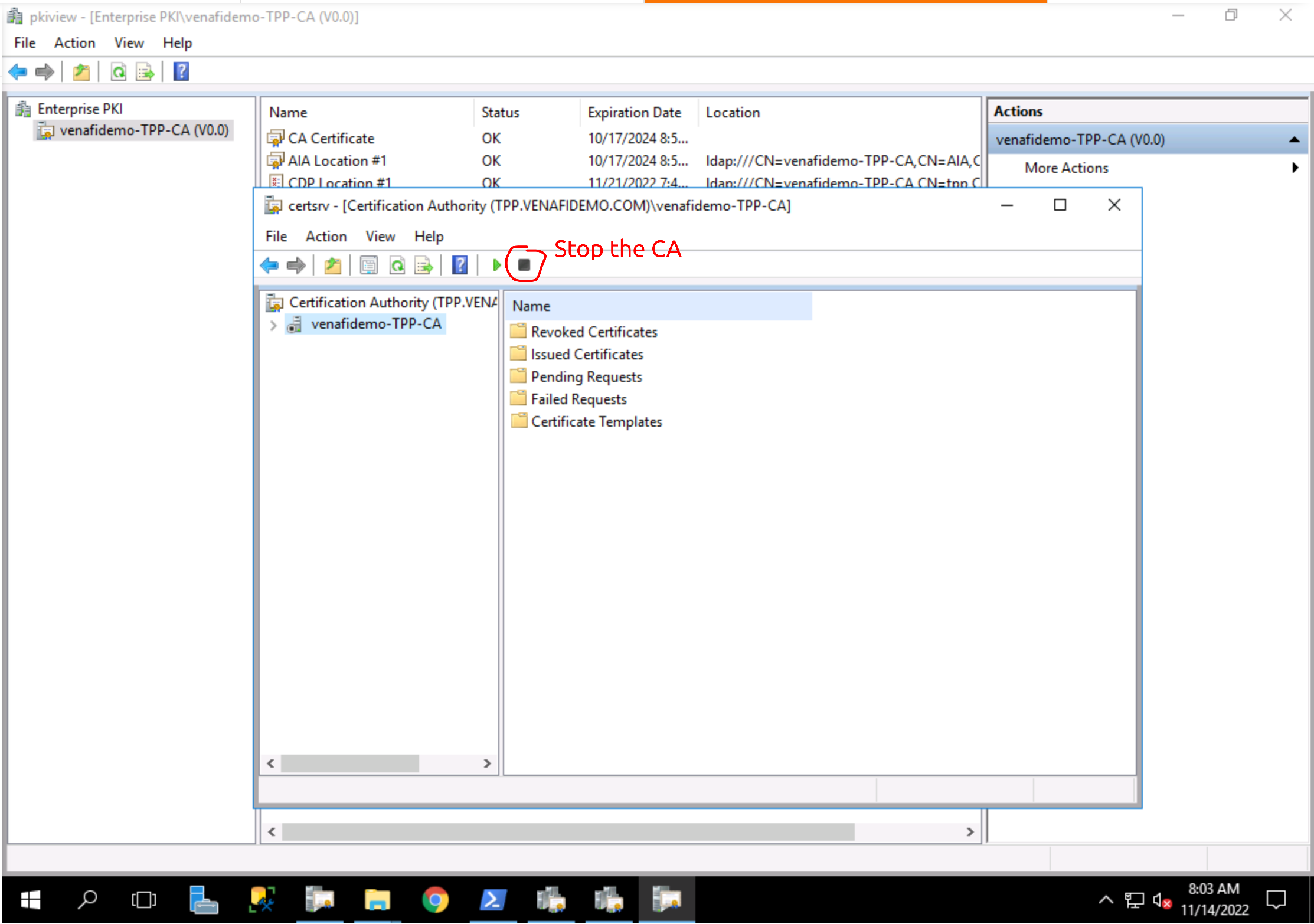 certsrv, right-clicked on the only entry, "Manage CA...", and then clicked the "Stop" button:I then enrolled: