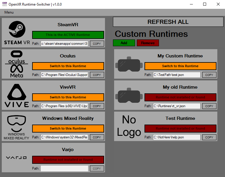 Allows you to quickly switch your System Default OpenXR Runtime between existing ones (currently SteamVR, Oculus/Meta, ViveVR, Windows Mixed Reality & Varjo) if installed & custom ones, which you can add manually to the program.