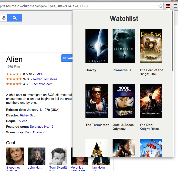 Watchlist chrome extension #Features add to watchlist button for google search results and imdb watchlsit popup #screenshots ###google search results ###IMDB ##google search results (movie is already in watchlist) ##popup
