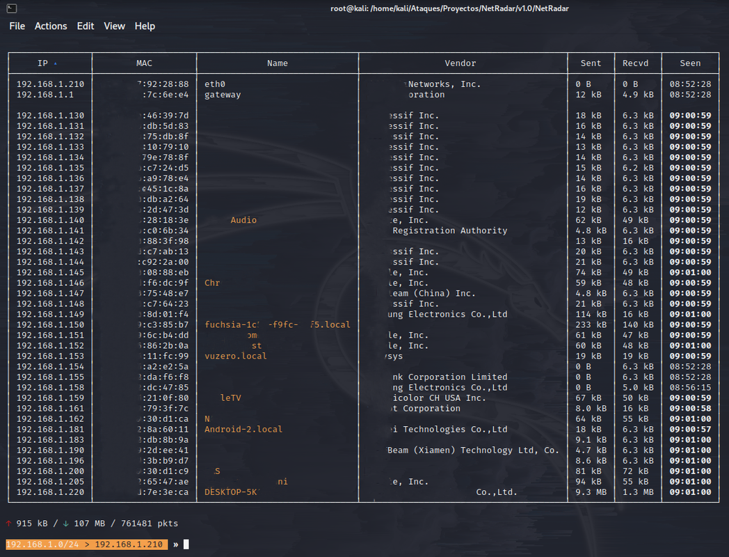 ☑️ Escáner de Red Local (Varios Dispositivos --> [Escaneo Rápido IPs (IPs, MAC, Vendedor Mac), Escaneo Rápido IPs + Puertos (IPs, N° Puertos, Servicio de cada Puerto, Mac, Vendedor Mac),Escaneo Continuo IPs (IPs, MAC, Vendedor Mac, Name, KB Enviados y Recibidos), Escaneo Avanzado IPs Puertos (N° Puertos, Estado, Servicio de cada Puerto, Versión de cada Servicio, Información del Contenido de cada Puerto, Mac, Vendedor Mac, Sistema Operativo, si tiene Host Información sobre él), Escaneo en Busca de un Servicio en Específico (HTTP/HTTPS, SMB, FTP, SSH, Telnet, Windows, NetBIOS)] [Ejemplo Gráfico]