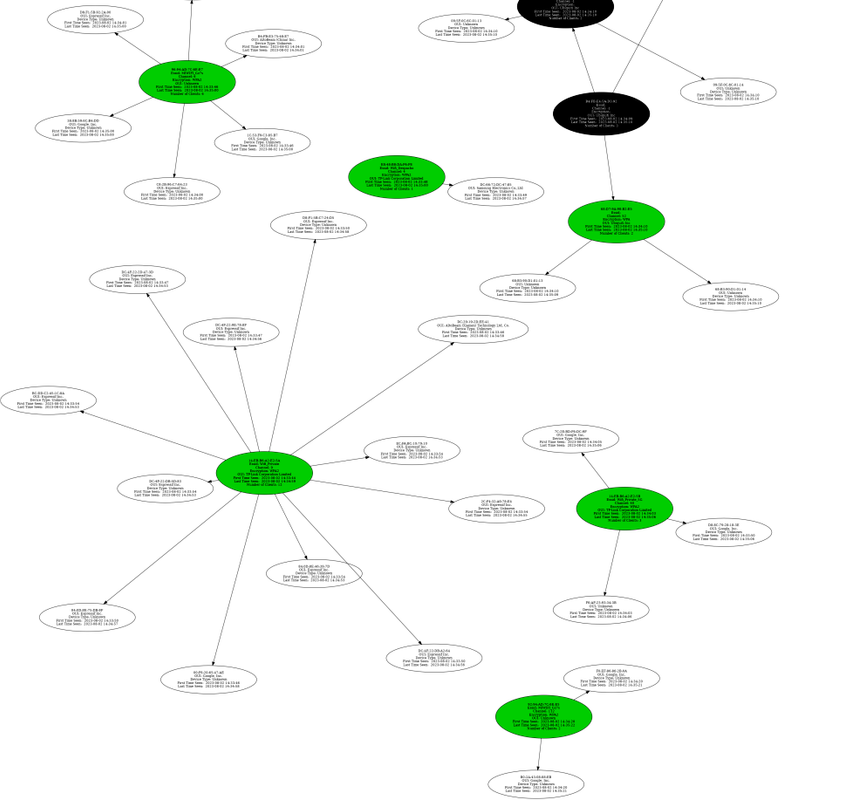☑️ Escáner Dispositivos Conectados a una Red Wifi --> [Muestra los dispositivos Wifi conectados a una Red Wifi, cuando finaliza el escaneo te crea un Gráfico en el que te muestra un esquema de los dispositivos conectados mostrando la MAC de los dispositivos, la cantidad de Tráfico, la distancia entre cada dispositivo y nuestra Tarjeta de Red, los paquetes de perdida, Notas y Probes.] [Ejemplo Gráfico]