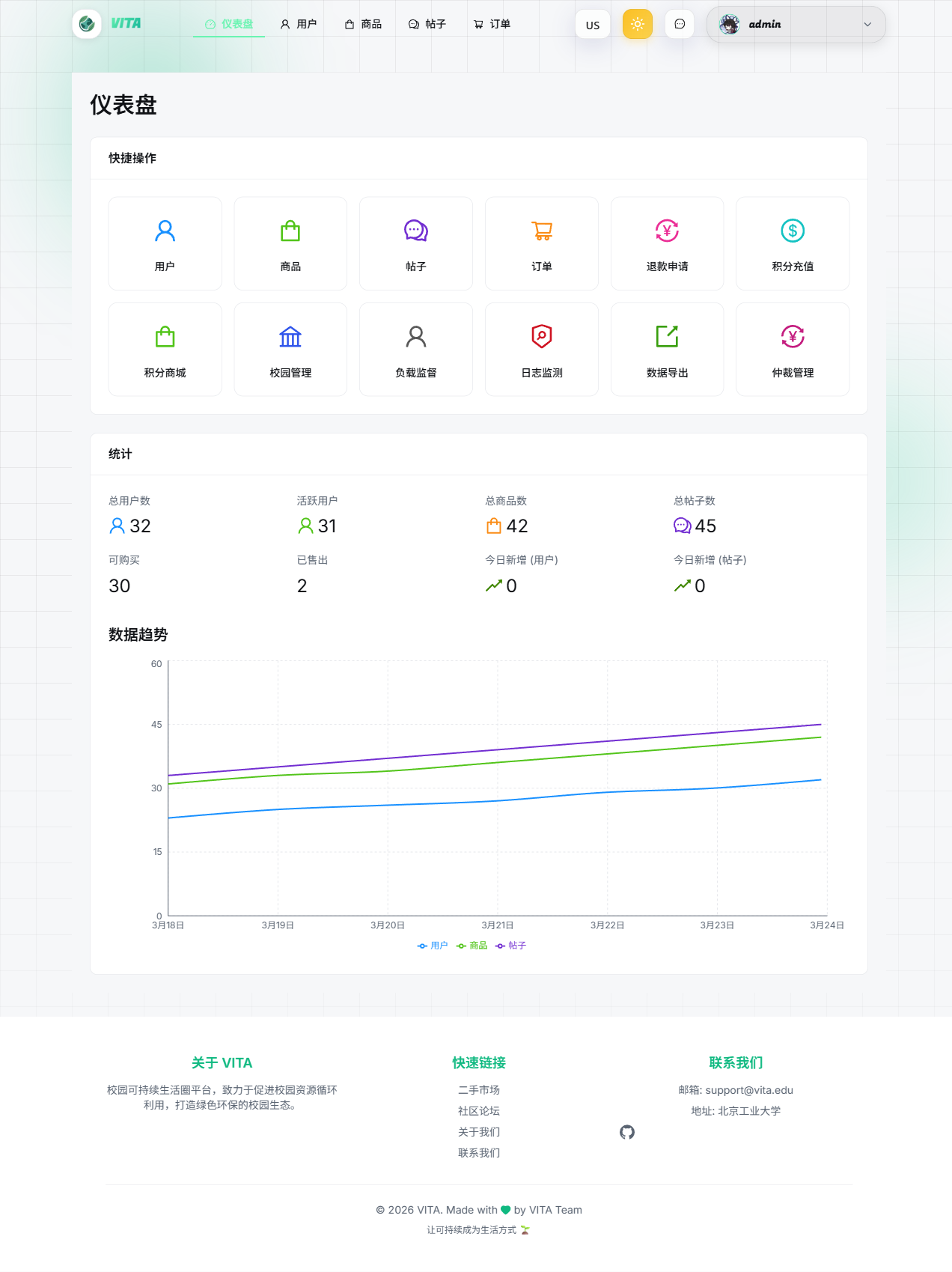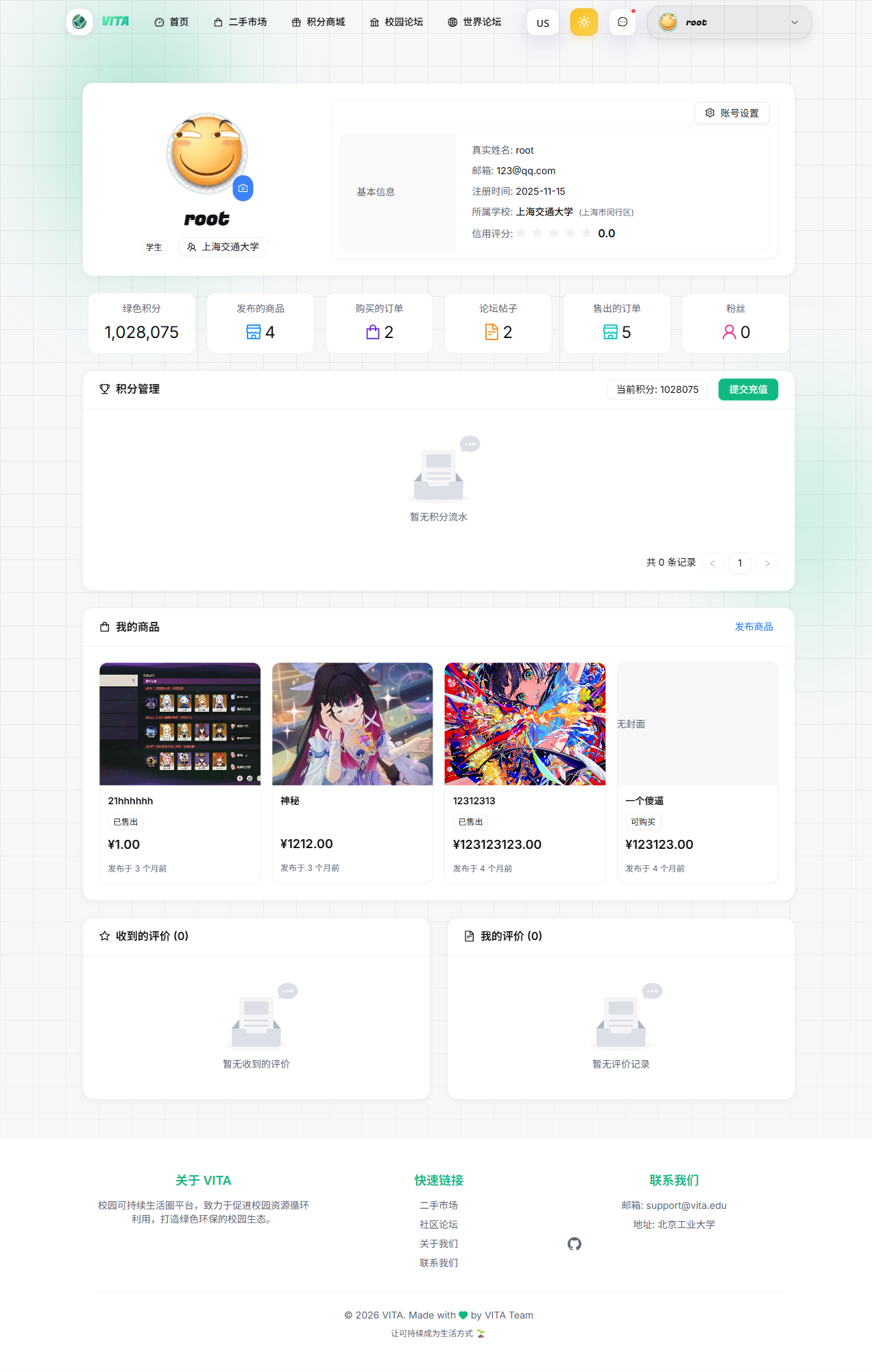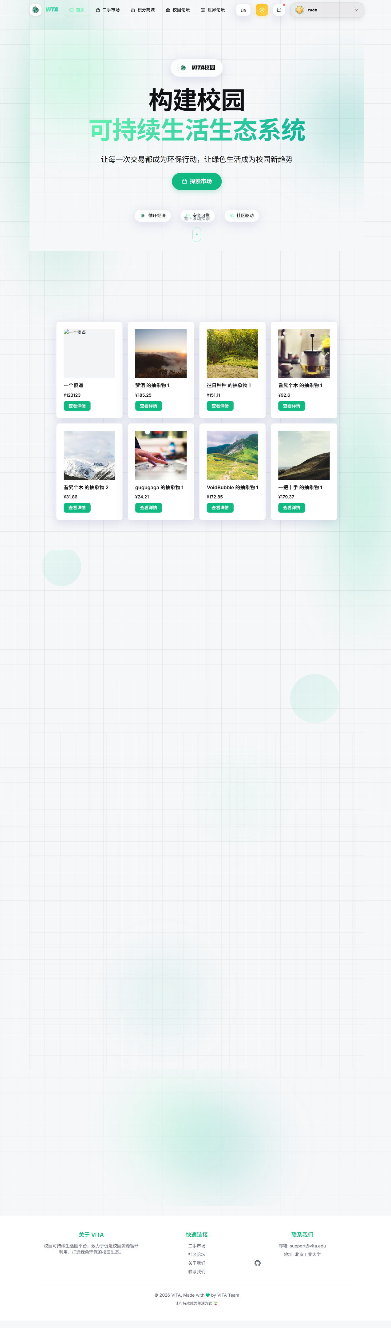 VITA 是一个面向大学校园的资源循环平台,通过二手交易市场、社区论坛和绿色积分体系,将可持续理念融入日常校园生活。