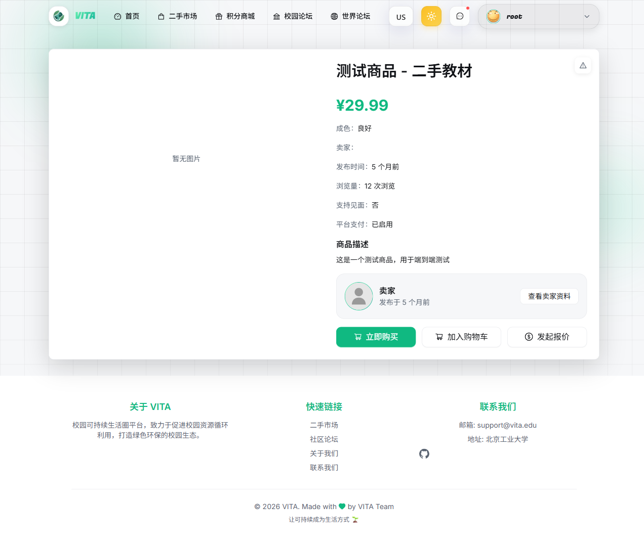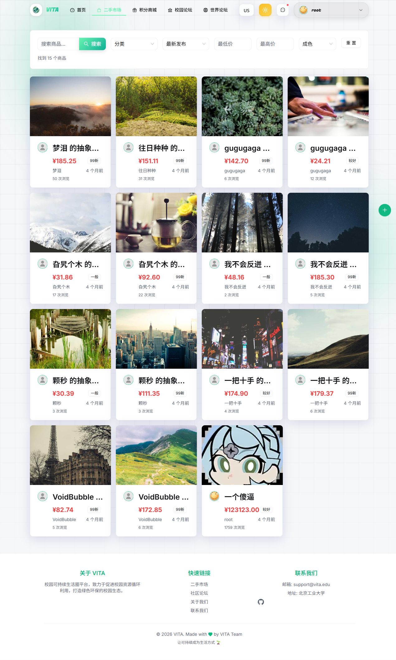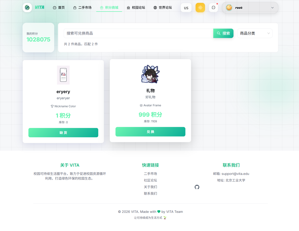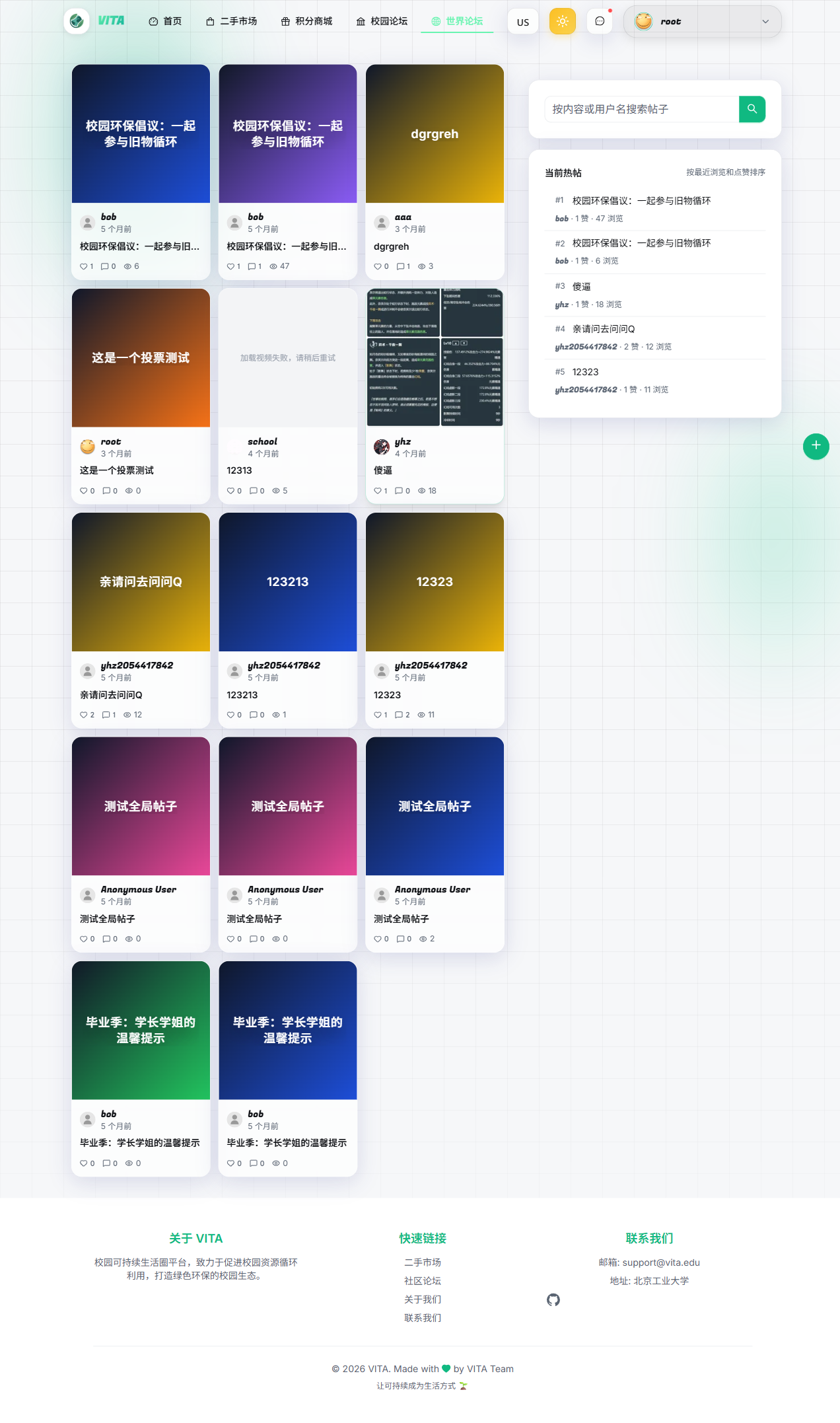 VITA 是一个面向大学校园的资源循环平台,通过二手交易市场、社区论坛和绿色积分体系,将可持续理念融入日常校园生活。