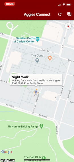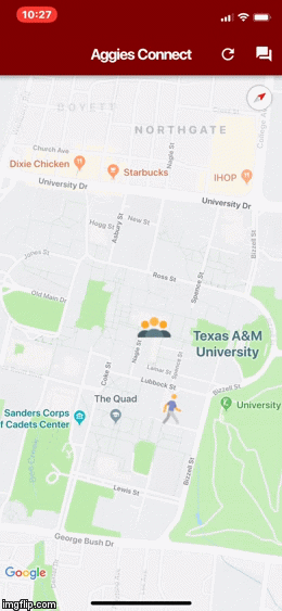 Aggie Connect (AC) is a cross-platform mobile application, successfully running on all IOS and Android devices, built on top of Google's reactive UI toolkit, flutter. Aggies Connect is a great way for any student, whether it's their first day on campus or even those looking for an addition to their sports team to find new members, but most importantly giving them an extra layer of safety.