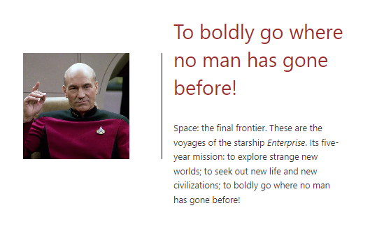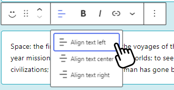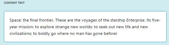 The content of the block. It's a text field. Just type in the content. If you click on the input a toolbar will appear with some options to format the text. You can choose between aligning the text to the left, center, right or justify it. You can also make the text bold, italic, strikethrough, add a link, or add a quote.