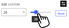 If you want to set a custom size, just click on the settings button on the top right corner of the sidebar. On this mode, you can type in the size you want on the input. Also, you can use the slider. If you need to go back to the default sizes, just click on the "Reset" button.