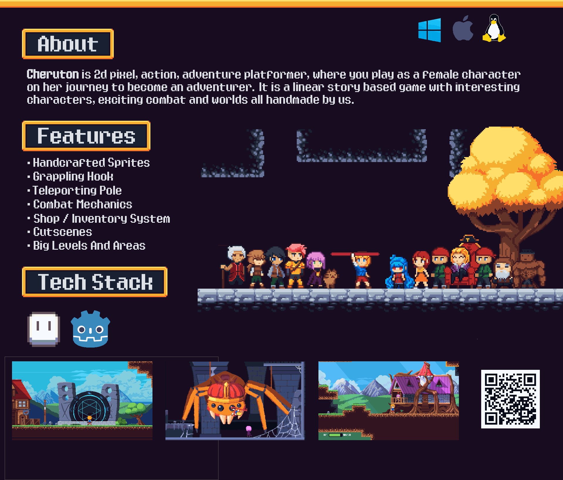 Go on an adventure in the land of Cheruton! An handcrafted pixel art world where you meet new friends and fight dangerous enemies. Visit towns, explore dungeons and upgrade your items as beautiful chiptunes play in the background.