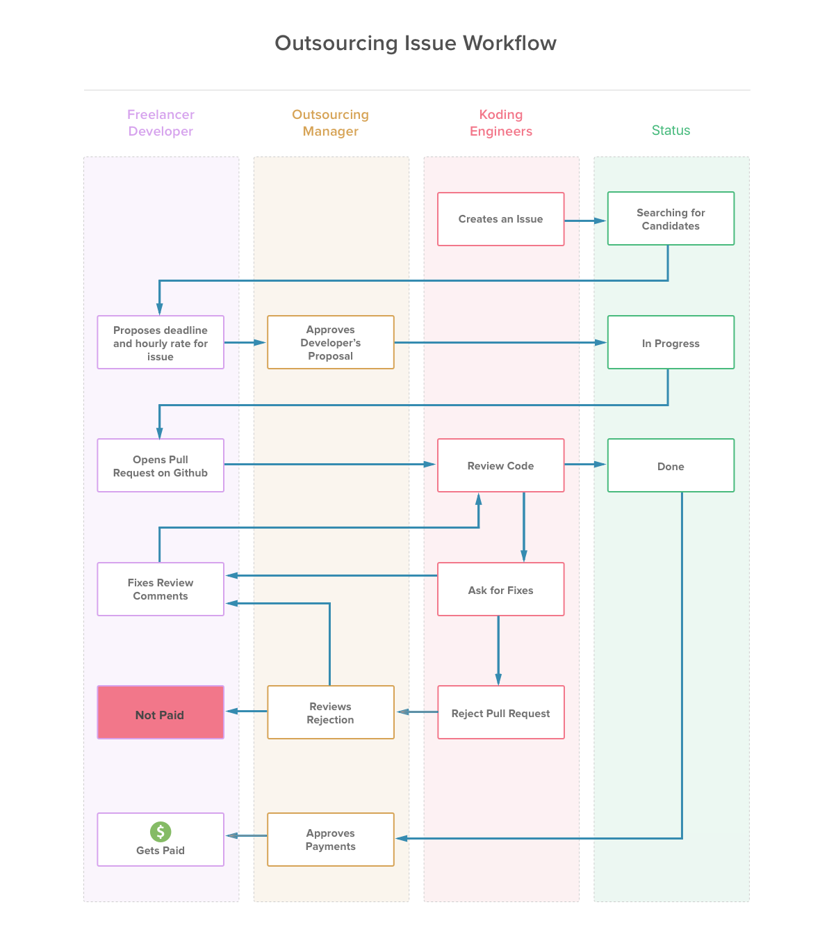 - Koding can cancel the issue if and only if nobody started to work on it. Otherwise, Koding has to make a full payment to the developer.