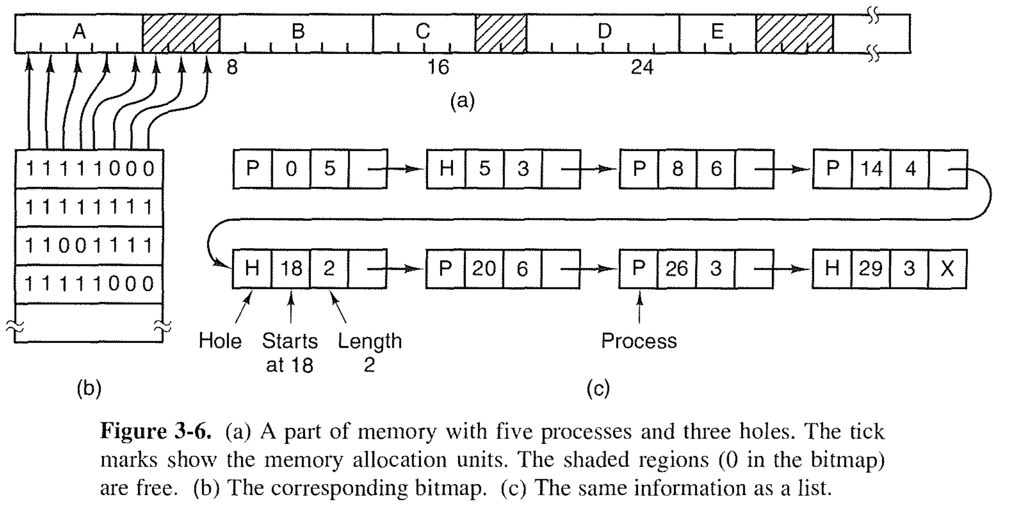 - 使用位图的内存管理 提供了一种简单的利用一块固定大小的内存区域能对内存使用情况进行记录的方法,但是问题在于当把一个占 k 个单元的进程调入内存时,存储管理器必须搜索位图,在位图中查找 k 个连续 0 的串>,这个查找过程是个耗时操作。