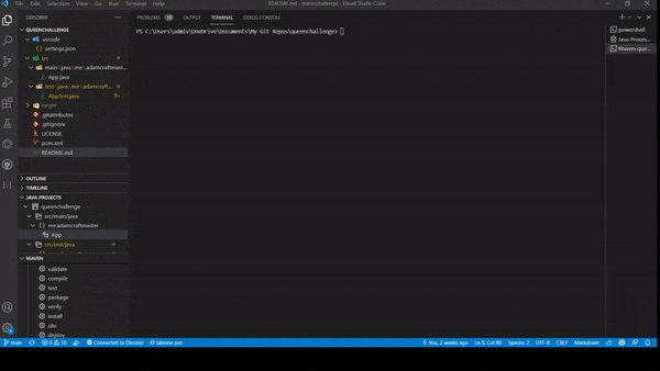 mvn package -f "(location of pom.xml)"java -jar .\target\queenchallenge-x.x-SNAPSHOT.jarmvn test -f "(location of pom.xml)"👤 Adam Nativ