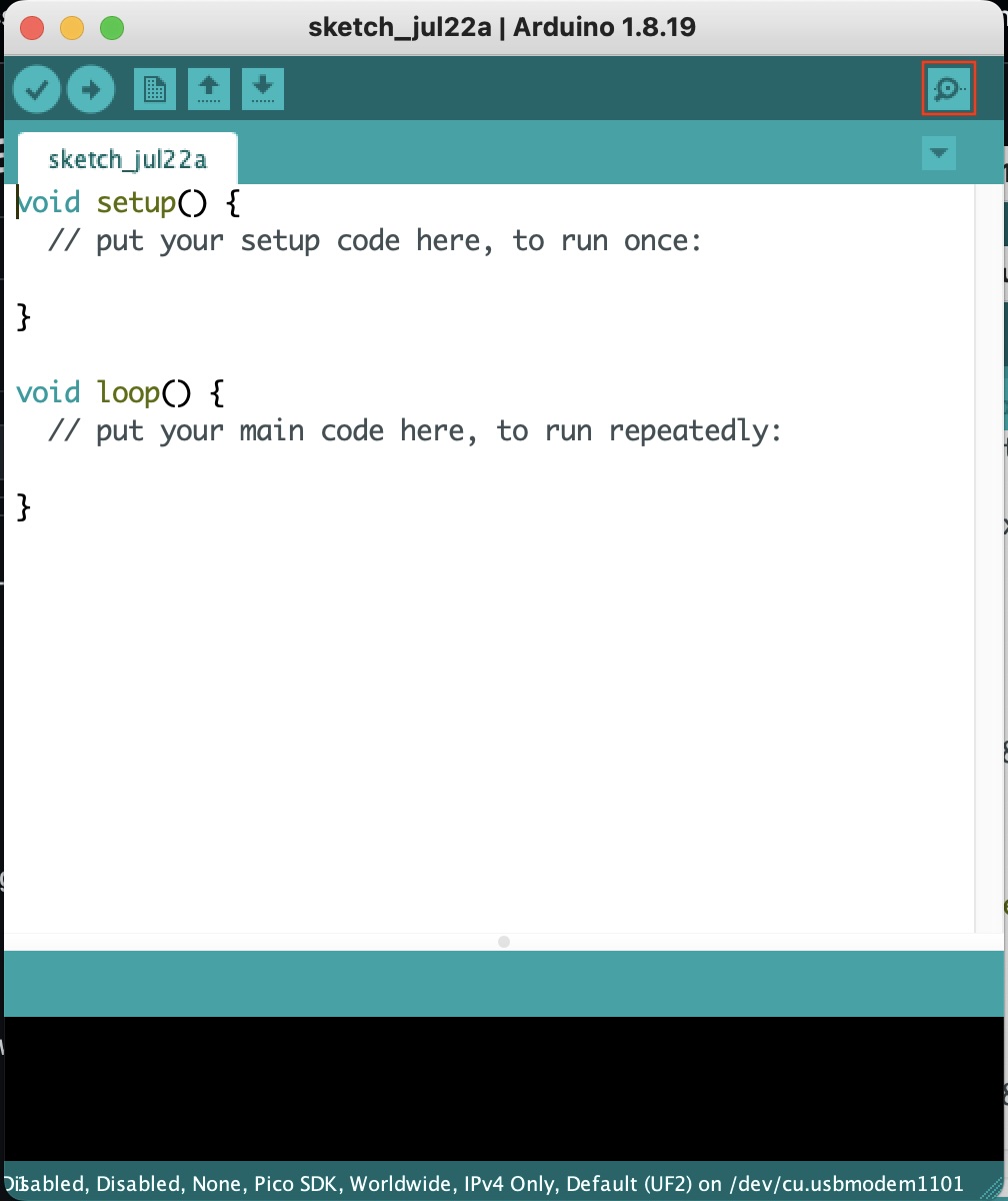 Run the Arduino IDE on your computer. If you haven't used it before, you will need to select a Board - Uno will work fine if you haven't installed the Pico board as described in: Adding New Sensors