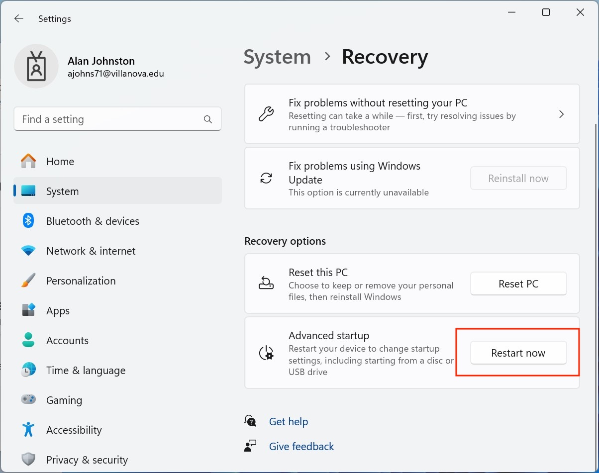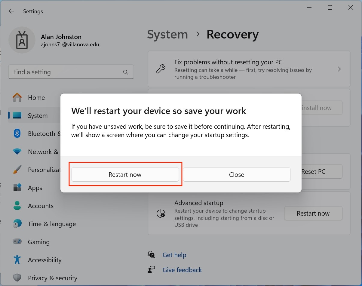 Select Restart Now again