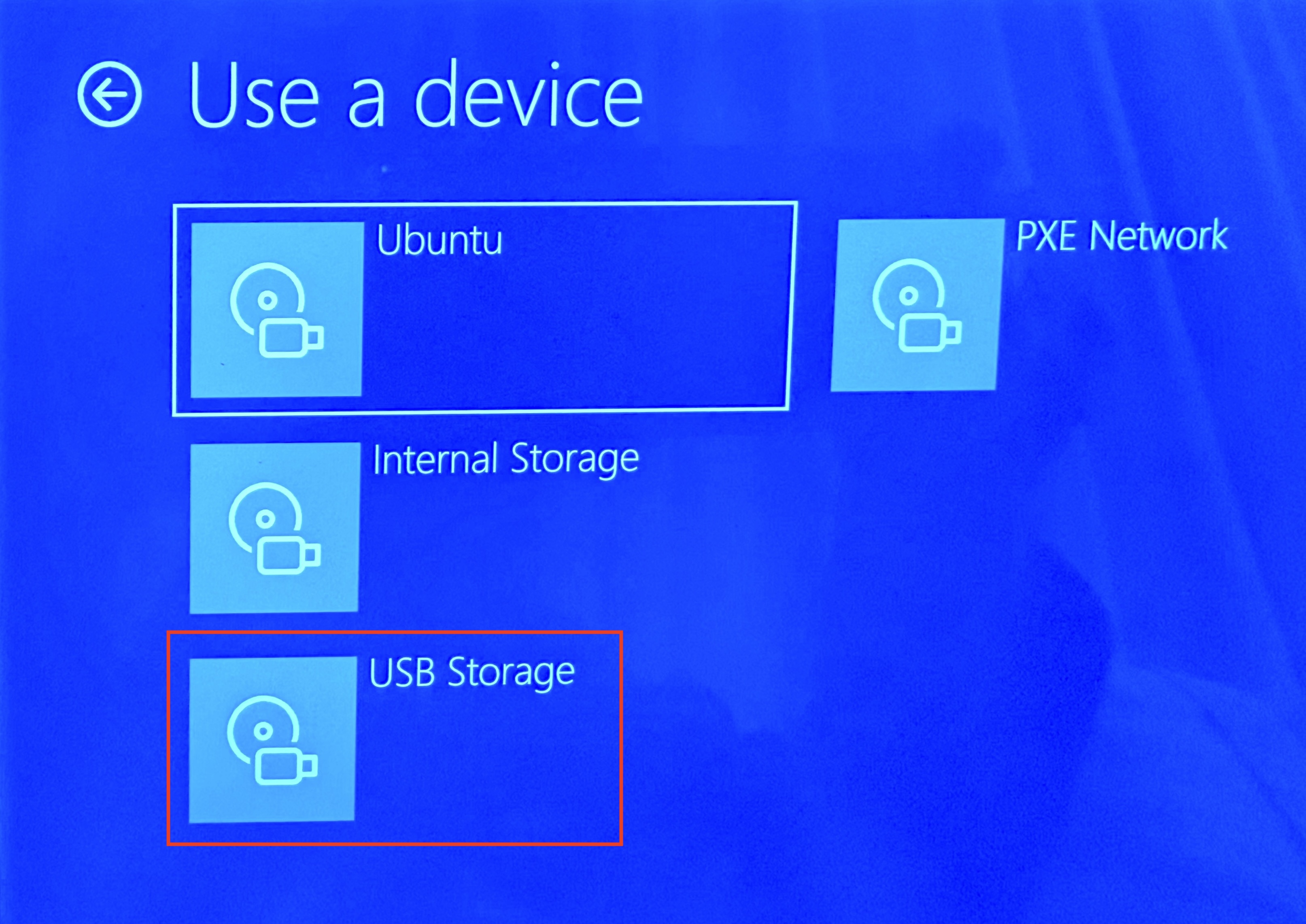 Then use the cursor keys to select USB Storage (IMPORTANT: If there is an option that says "Ubuntu" DO NOT SELECT IT - if you do, it will use a different Ubuntu installation, not the Flash Drive)
