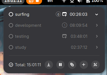 - Screen locking and sessions: automatically pauses all active timers on screen locking and resumes them on unlocking