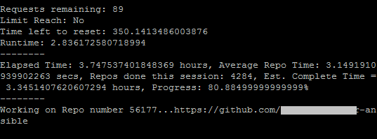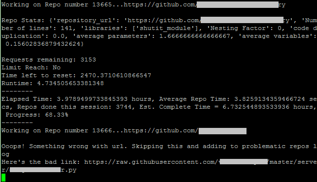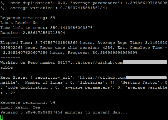 The github API was used for grabbing only python files in each repo for analysis. As opposed to cloning each repo locally, this approach cut down on bandwidth and the time to download and go through tons of repo files that were irrelevant to the cause - some repositories can be large.