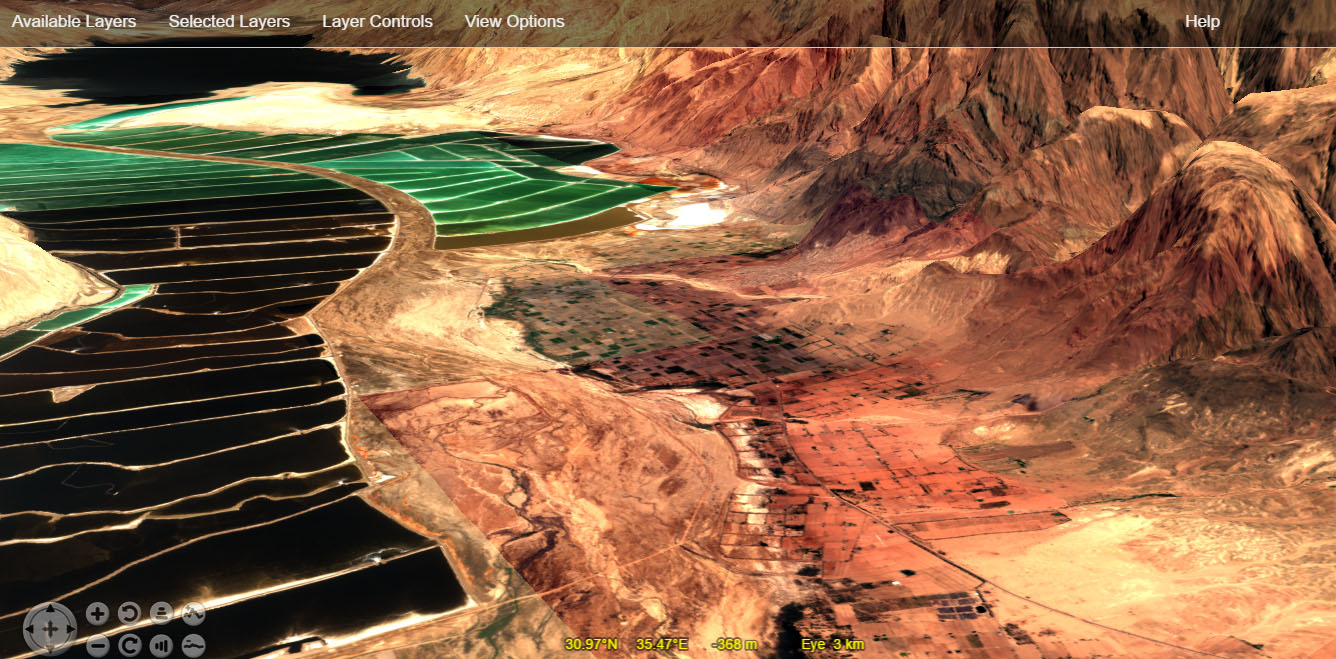 Image showing the Dead Sea in Jordan, as shown from ESA Sentinel - True Color layer. World Weather has full three dimensional capabilities, including elevation data for all locations on Earth.