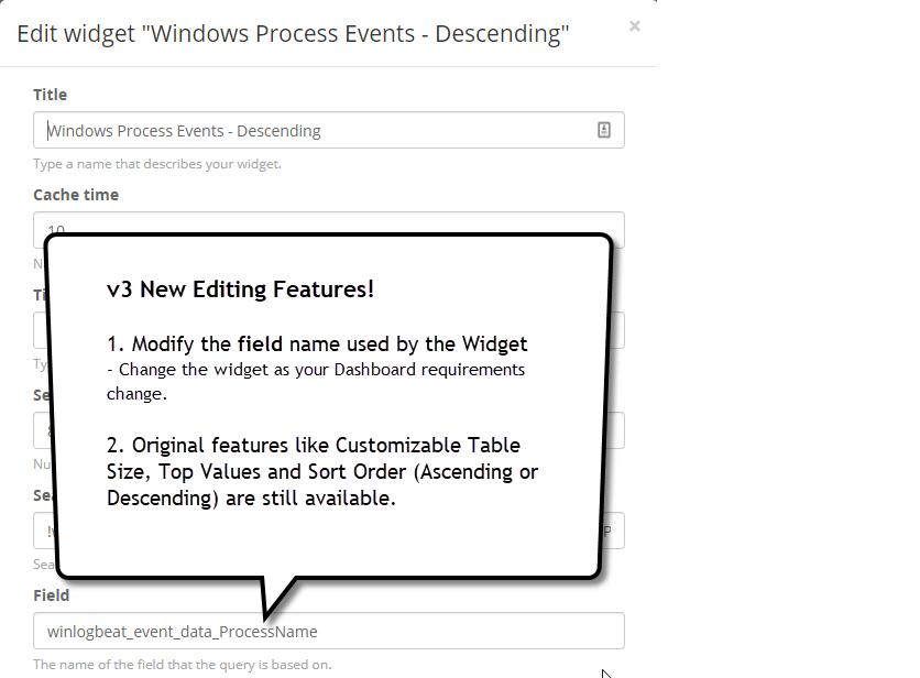 This version adds a Customize Menu so that the Sort Order, number of Top Values and Table Size can be modified in the Search/Stream Views. The values selected from the menu will persist to the configuration screen when you select Add To Dashboard.