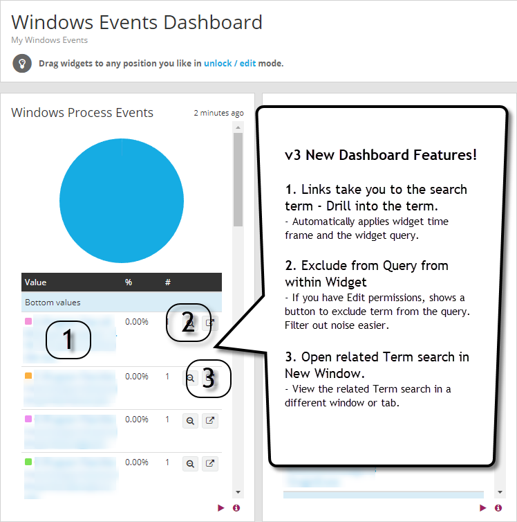 - Provides "Exclude from Query" button if the user has permissions to edit the dashboard. Can filter out noise from the widget now.