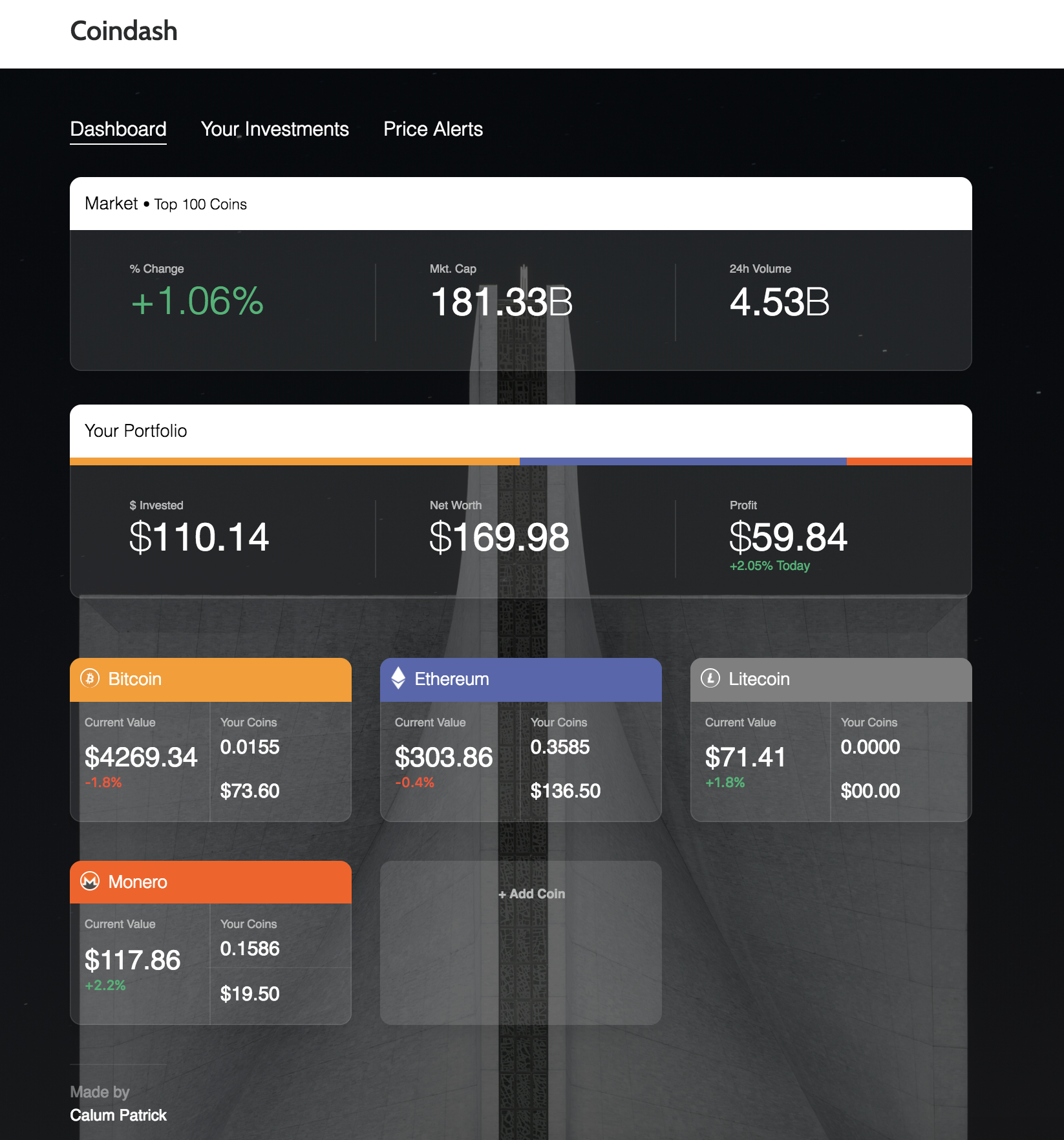 CoinDash (WIP) View live (static): https://calumptrck.github.io/CoinDash/ Next Steps Mobile Friendly Set up node choose api and integrate w/ node set up real time refresh and balance editing Remove Investments and Price Alerts page from initial version, focus on dashboard