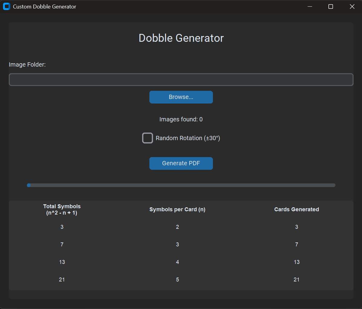 Dobble Generator is a desktop application that allows you to generate printable PDF cards for the popular game mechanics found in Dobble (also known as Spot It!).