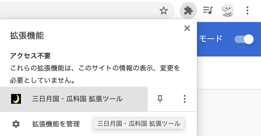 Chrome右上の拡張機能ボタンをクリックし、「三日月国・瓜科国 拡張ツール」を選択して
