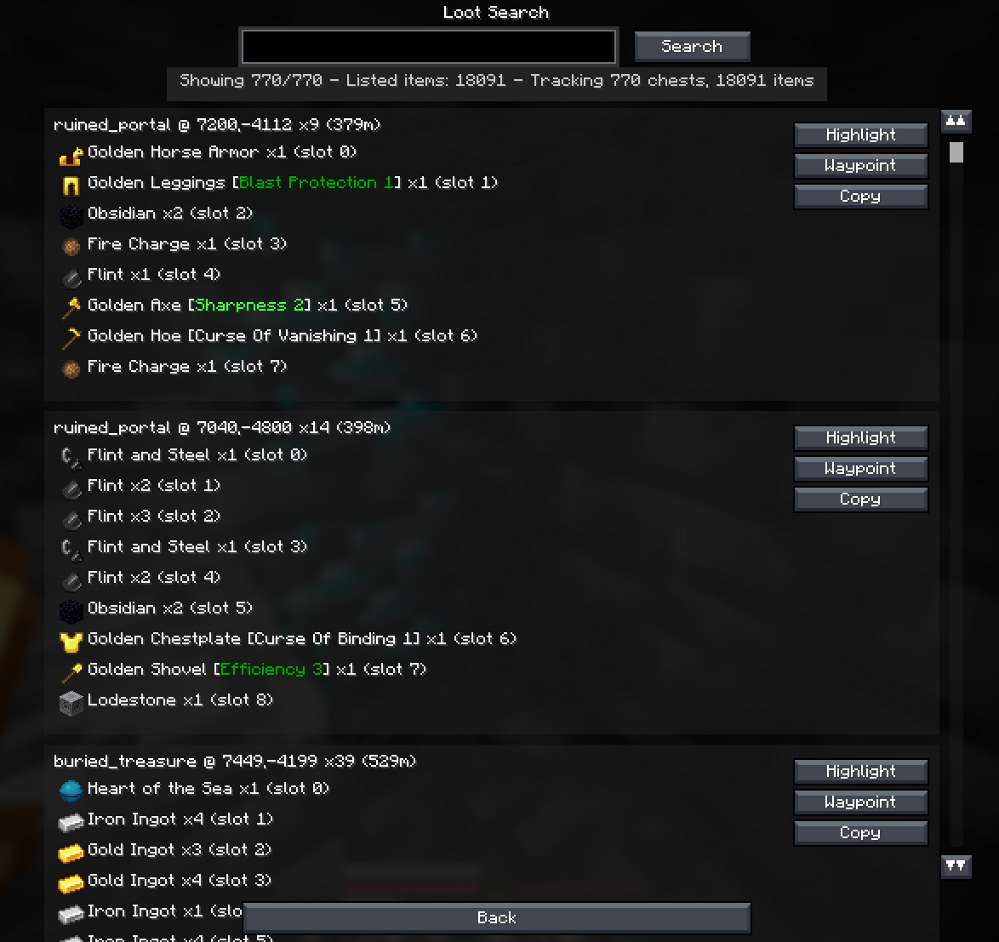 - Search the integrated SeedMapper loot database by item name, ID, enchantment, or NBT terms