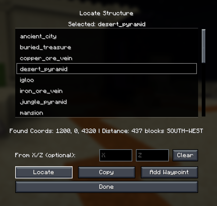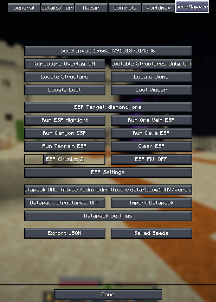 Locate structureLocate biomeLocate lootLoot viewerRun ESP highlightRun ore vein ESPRun canyon ESPRun cave ESPRun terrain ESPClear ESPDatapack settingsSaved seeds