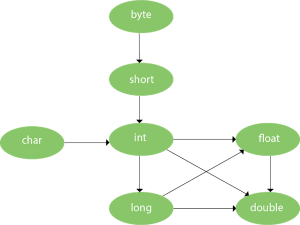 “如上图所示,byte 可以向上转换为 short、int、long、float 和 double,short 可以向上转换为 int、long、float 和 double,char 可以向上转换为 int、long、float 和 double,依次类推。”